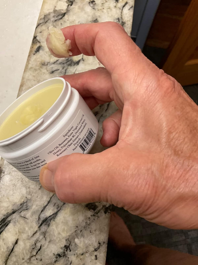 This one he doesn't even notice. Been using for like 10 days and his patches are smaller and less angry looking. Not a miracle but it's actually working without causing more problems.